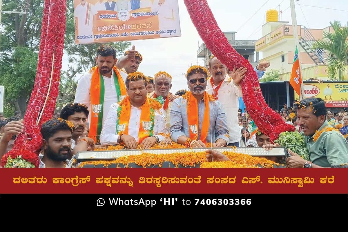 Palicheralu, Sidlaghatta : In a recent development, MP S. Muni Swamy, while campaigning for BJP candidate Seekal Ramachandra Gowda, urged the Dalit community not to support the Congress party. Swamy criticised the Congress for its historical failure to advocate for the rights of Dalits and highlighted how the party neglected the cremation of Dr. B.R. Ambedkar, the architect of the Indian Constitution, in Delhi. He emphasised that the oppressed society should not vote for a party that twice defeated such an esteemed figure in the elections.