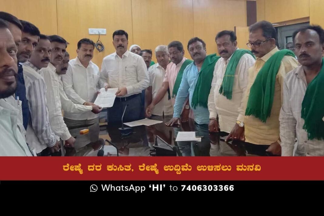 A group of farmers, including Tadoor Manjunath, Muninanjappa, HK Ramesh, Devaraj, Kempanna, and Nagaraj, along with reelers, including Ansar Khan, Anwar Saab, Anand Kumar, G. Rahman, Farooq, Mujahid Pasha, and Kuchchanna Ananthu, were present during the petition submission to the Silk Commissioner’s office.