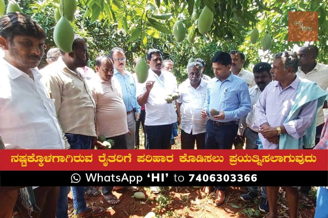 ತಾಲ್ಲೂಕಿನಾದ್ಯಂತ ಭಾನುವಾರ ಸುರಿದ ಮಳೆಯಿಂದ ಮಾವು, ರೇಷ್ಮೆ, ವಾಣಿಜ್ಯ ಬೆಳೆಗಳಾದ ದಾಳಿಂಬೆ, ದ್ರಾಕ್ಷಿ, ಟಮ್ಯಾಟೋ, ಮತ್ತಿತರ ಬೆಳೆಗಳು ಹಾಳಾಗಿರುವ ಬಗ್ಗೆ ಗಮನಕ್ಕೆ ಬಂದ ತಕ್ಷಣ ಸಂಬಂಧಪಟ್ಟ ಇಲಾಖೆಯ ಅಧಿಕಾರಿಗಳಿಗೆ ಸ್ಥಳಕ್ಕೆ ಭೇಟಿ ನೀಡಿ ರೈತರಿಗಾಗಿರುವ ನಷ್ಟದ ವರದಿ ತಯಾರಿಸಿ ಸರ್ಕಾರಕ್ಕೆ ಸಲ್ಲಿಸುವಂತೆ ಸೂಚನೆ ನೀಡಿದ್ದು ಈ ಬಗ್ಗೆ ಸರ್ಕಾರದ ಗಮನ ಸೆಳೆದು ನಷ್ಟಕ್ಕೊಳಗಾಗಿರುವ ರೈತರಿಗೆ ಪರಿಹಾರ ಕೊಡಿಸಲು ಪ್ರಯತ್ನಿಸಲಾಗುವುದು ಎಂದರು.