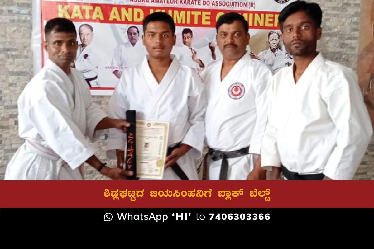 Sidlaghatta : A. Jayasimha, a student of Divya Bharat Karate Do Association from Sidlaghatta city, has achieved a significant milestone in his karate journey by earning the coveted black belt. Jayasimha has been under the tutelage of karate teacher Arun Kumar for the past 12 years and has participated in various karate tournaments at taluk, district, state, national and international levels.